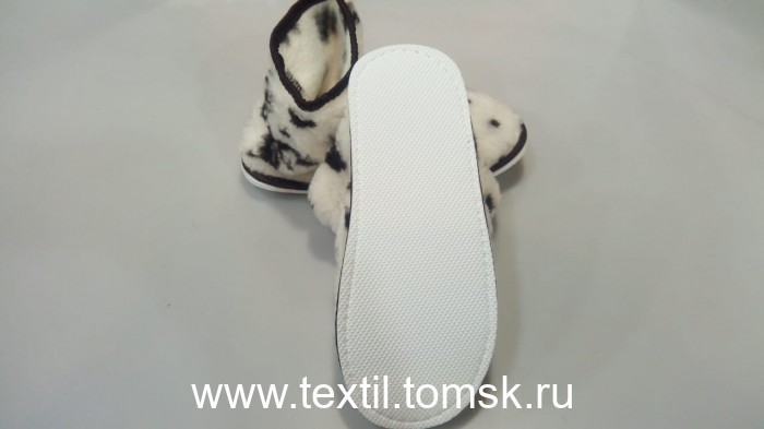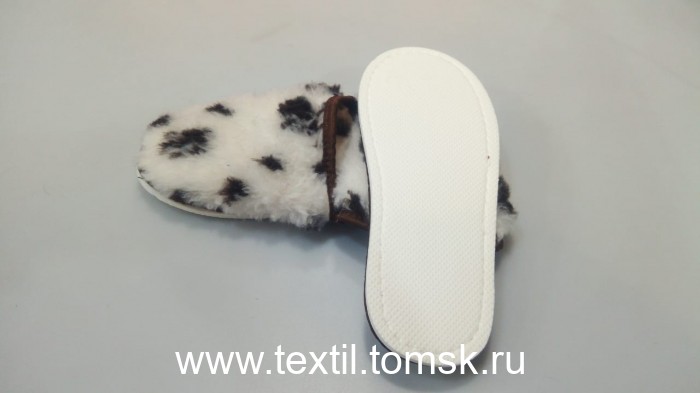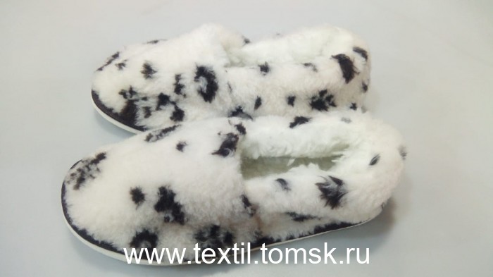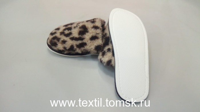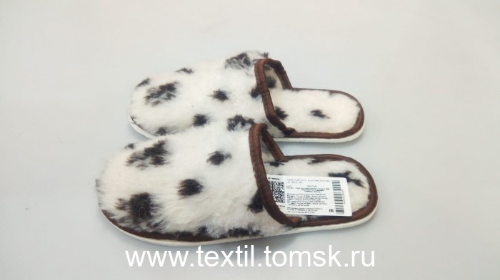 Артикул 8339 - Тапочки женские из овечьей шерсти с закрытым носком Материал верха: мех трикотажный с ворсом из овечьей шерсти 70% Содержание П/Э 30% Окантовка: тесьма Подошва: эвапласт толщина 5 мм Цвет подошвы: белый. Цвет верха : молочный с принтом Леопард Размер:39 российский. Полнота: 2 Бренд ТапМода. Страна производства Россия.