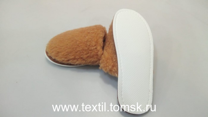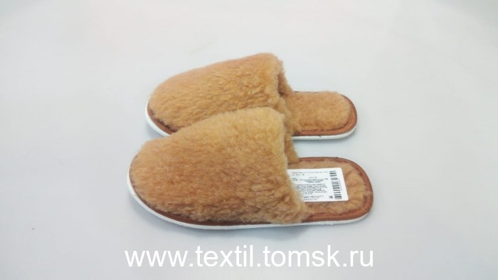 Артикул - Тапочки женские из овечьей шерсти с закрытым носком Материал верха: мех трикотажный с ворсом из овечьей шерсти 70% Содержание П/Э 30% Окантовка: тесьма Подошва: эвапласт толщина 5 мм Цвет подошвы: белый. Цвет верха : коричневый Размер:36 российский. Полнота: 2 Бренд ТапМода. Страна производства Россия.