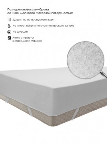Непромокаемый наматрасник с юбкой выполнен целиком из мембранной махровой ткани, поэтому высокий борт так же обладает водонепроницаемыми свойствами, и полностью защищает ваш матрас от влаги.